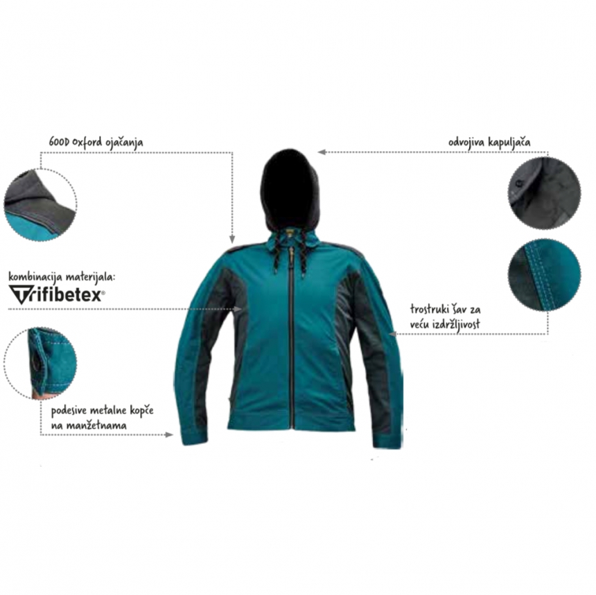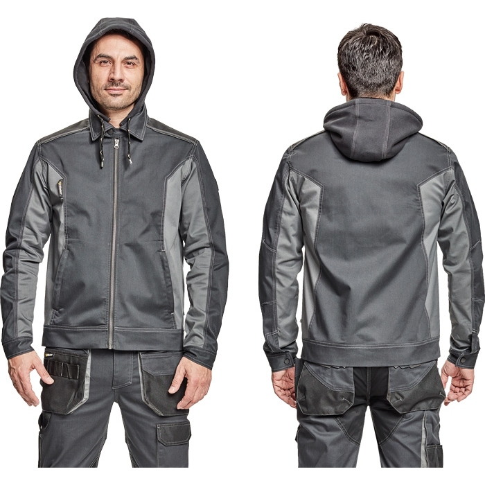 Muška radna bluza, sive boje, atraktivnog sportskog dizajna iz nove Dayboro kolekcije. Proizvedena od inovativnog TRIFIBETEX materijala koji karakteriše celu kolekciju, a mešavina je pamuka 62%, poliestera 35% i spandeksa 5%, težine 260 g/m2. Ima odvojivu kapuljaču, ojačanja na ramenima od Oxford materijala, praktične džepove i reflektujuće detalje.