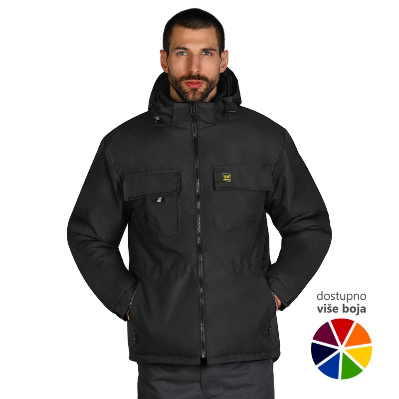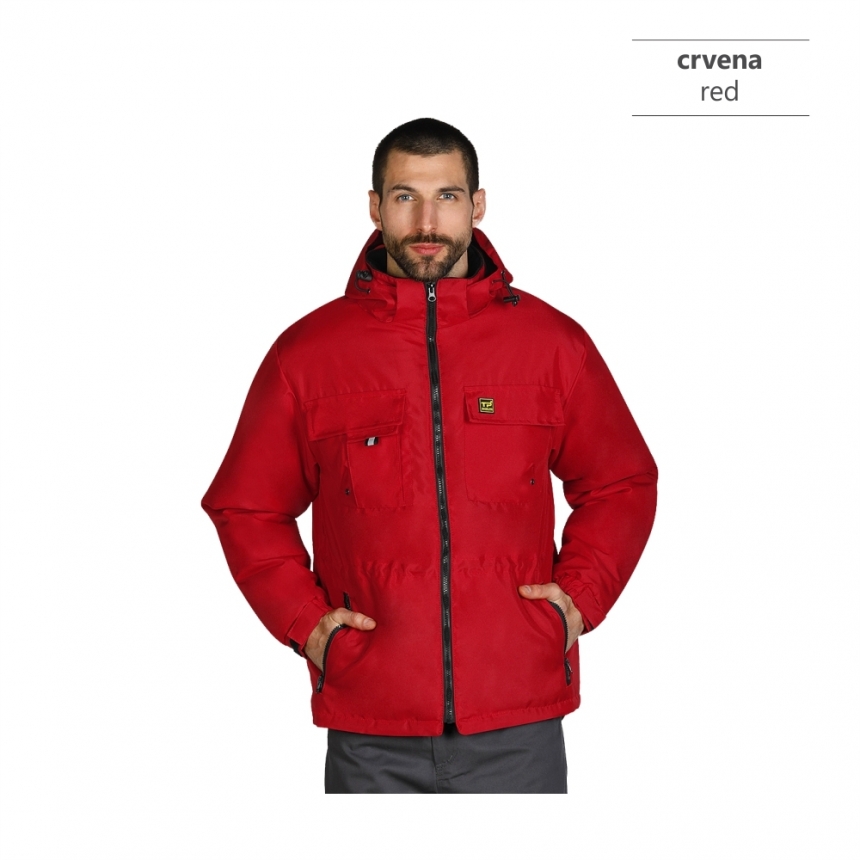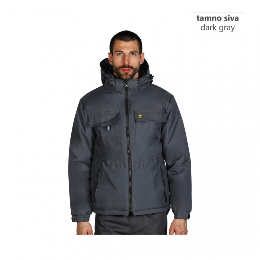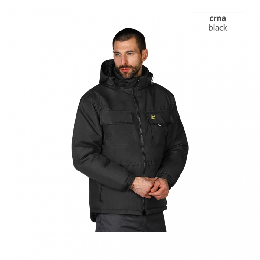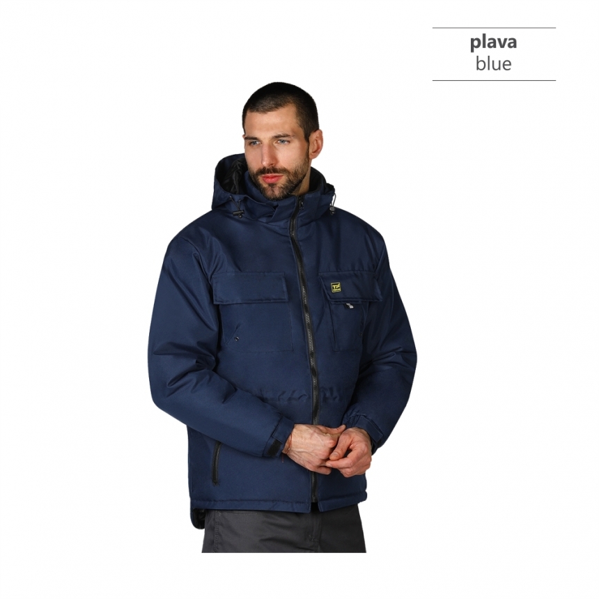 Radna zimska jakna sa visokom kragnom, kapuljača u kragni, elastične ranfle oko rukava sa čičak trakom za podešavanje širine rukava, duži zadnji deo, tri džepa na grudima, dva prednja džepa, jedan unutrašnji džep, skriveni unutrašnji rajsferšlus na leđima za lakši pristup prilikom štampanja.