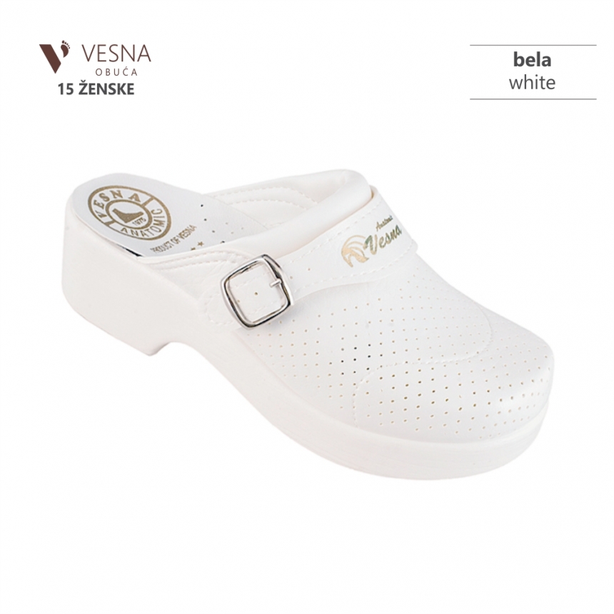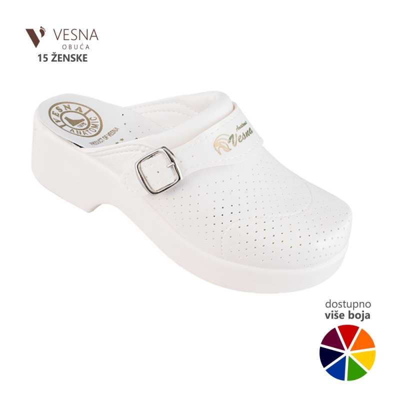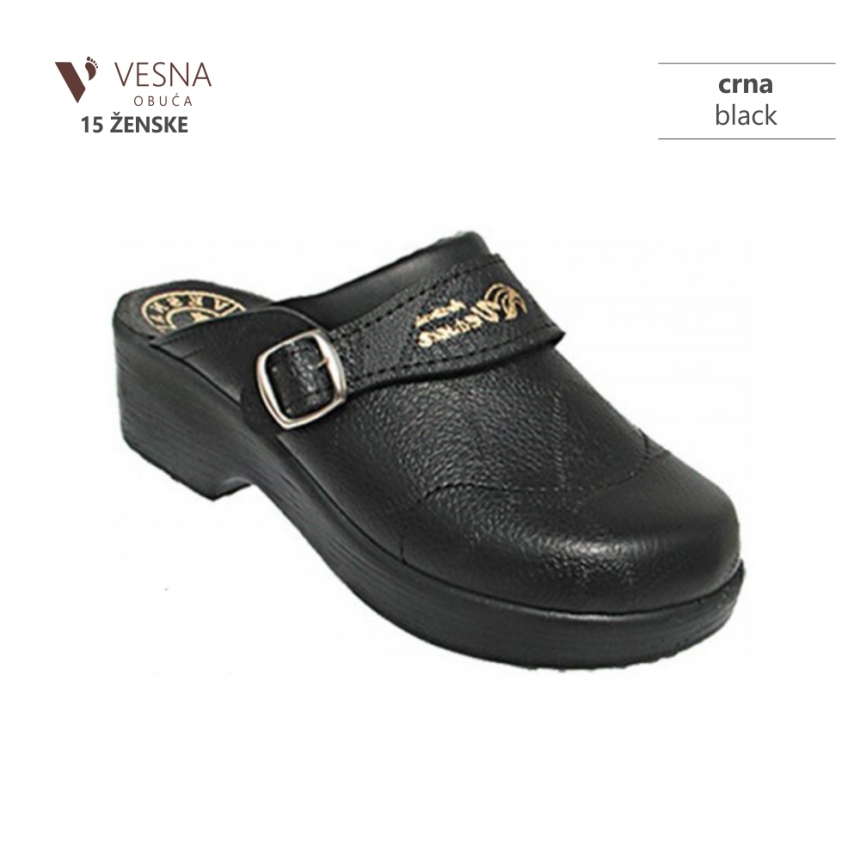 Radne ženske klompe od veštačke kože, sa tabanicom od filca i đonom od poliuretana. Imaju šnalu sa kaišem za prilagođavanje različitim oblicima stopala. Jednostavne za održavanje, mogu se prati.