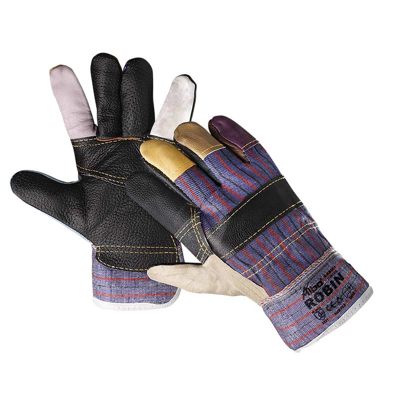 Goveđa koža, šarene, nadlanica i manžetna od platna, postava na dlanu. Može se koristiti u građevinskoj industriji, metalnoj industriji...