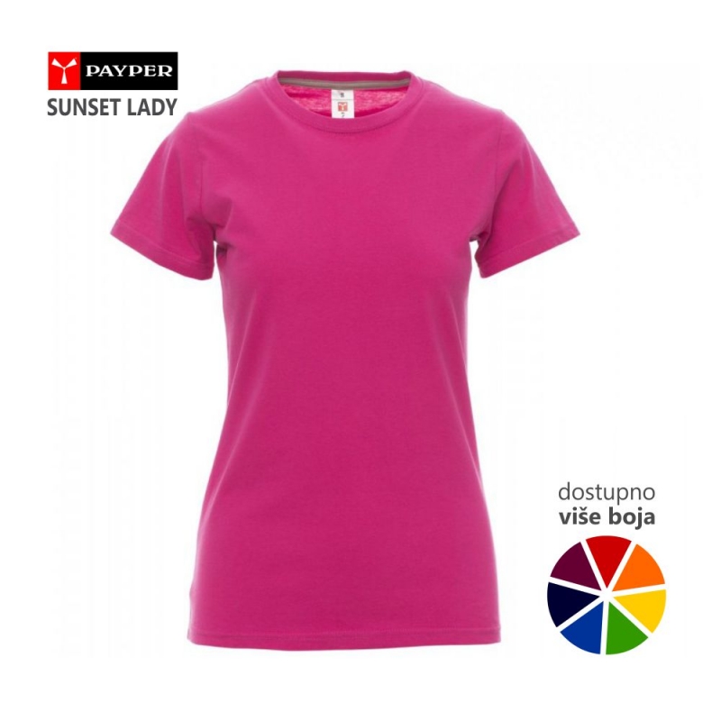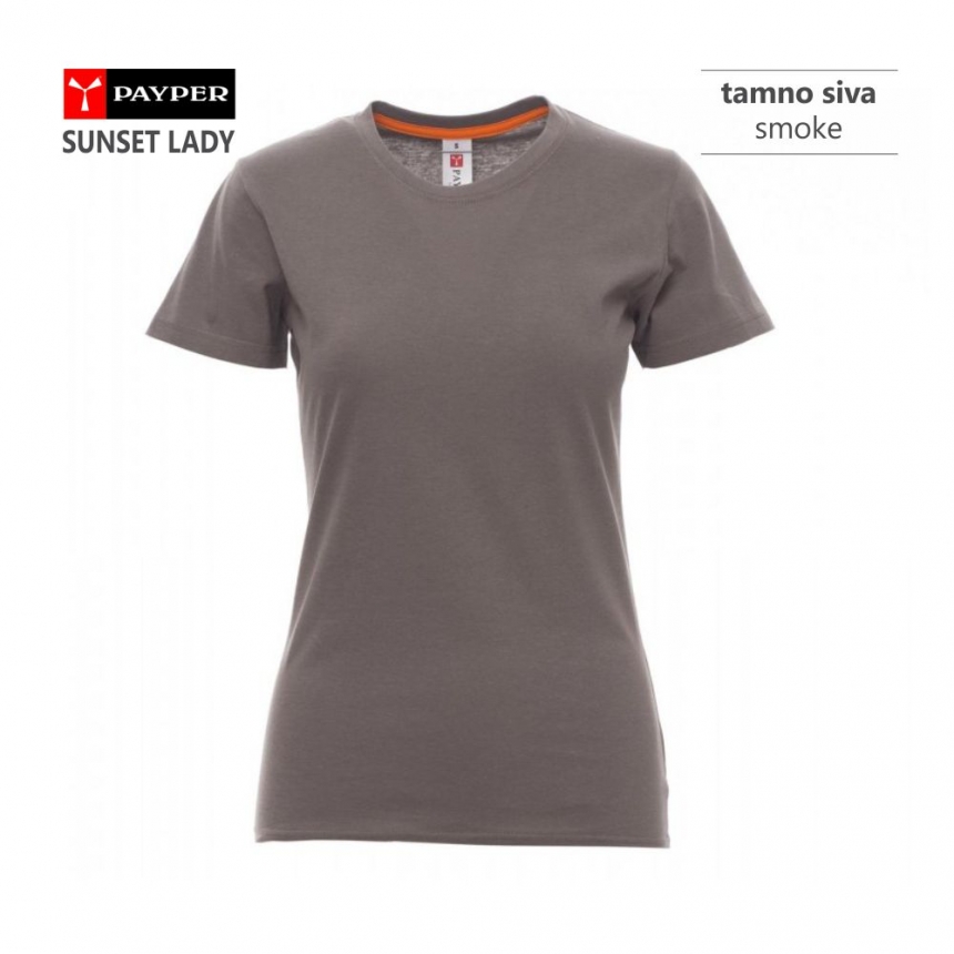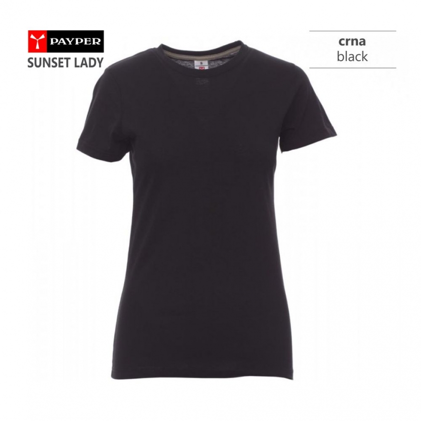 Majica kratkih rukava, model je ženskog kroja, blago strukiran i užeg kroja rukava, lepo prati oblik tela. Proizvedena je od 100% pamuka, težine 150 g/m2, ima elastični render oko vrata širine 1,5 cm i kružno je tkanina (bez bočnih šavova). Ima ojačanja (ušivena traka preko šava) celom dužinom ramena i u vratnom delu u kontrast boji.