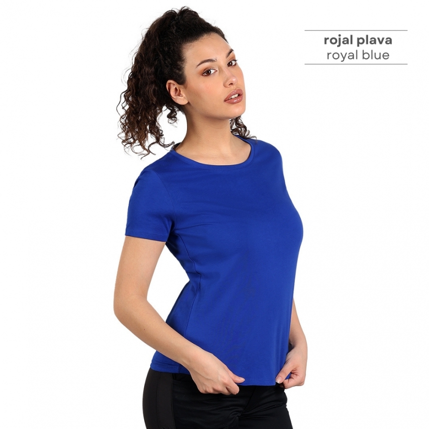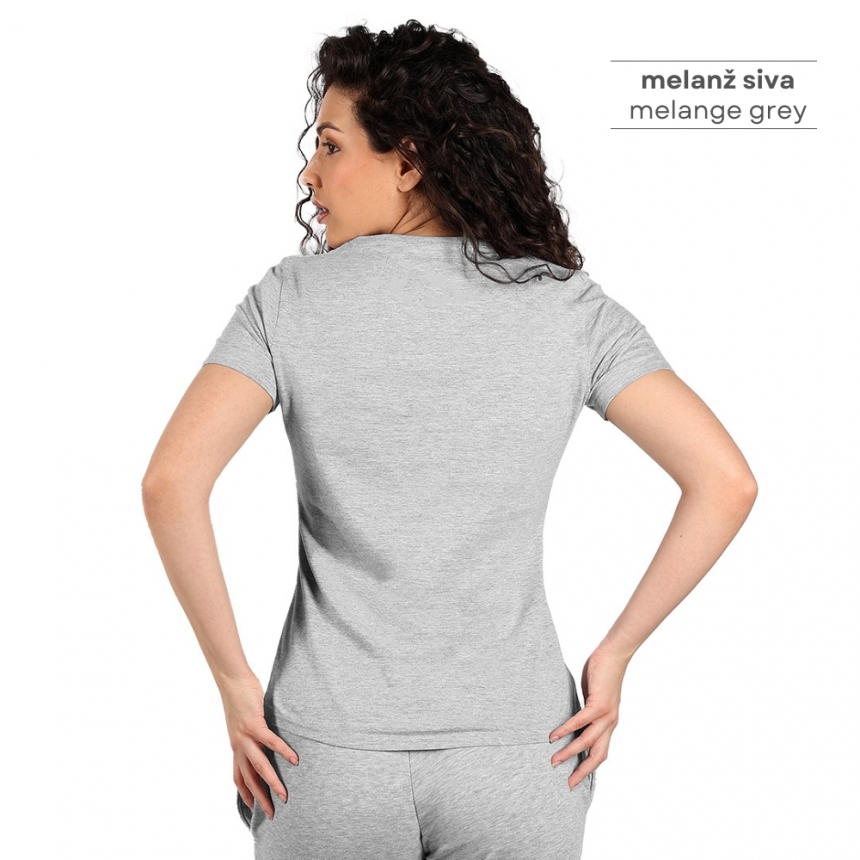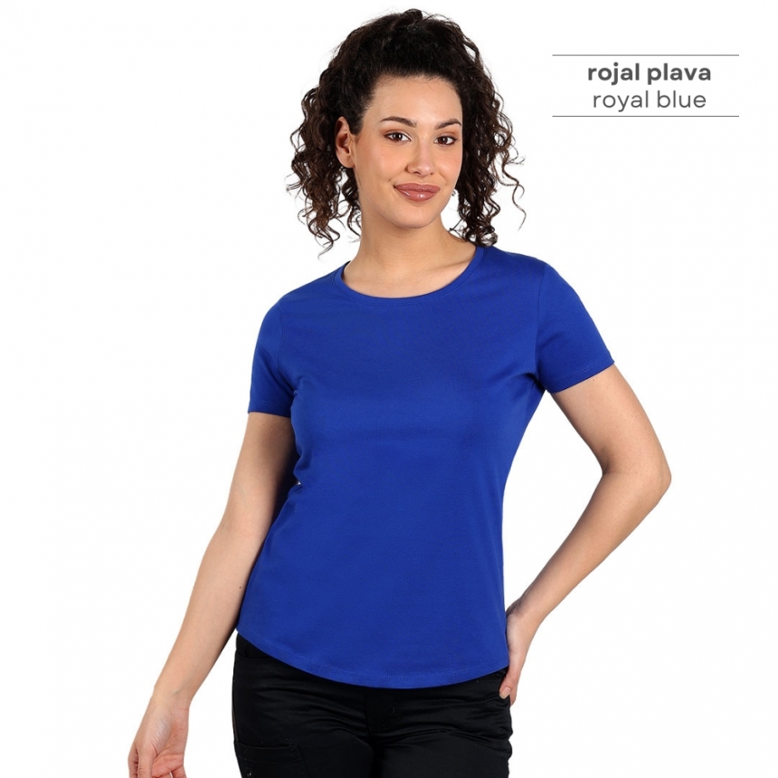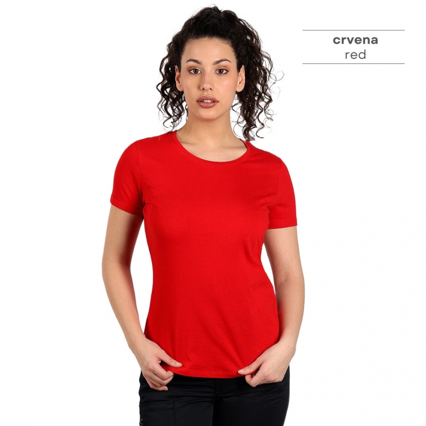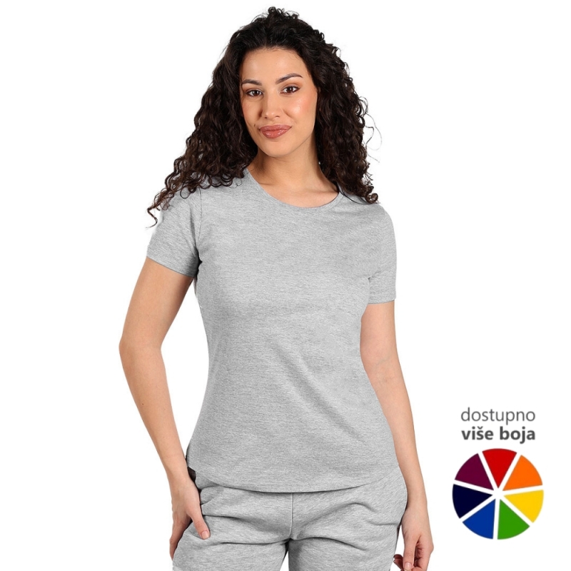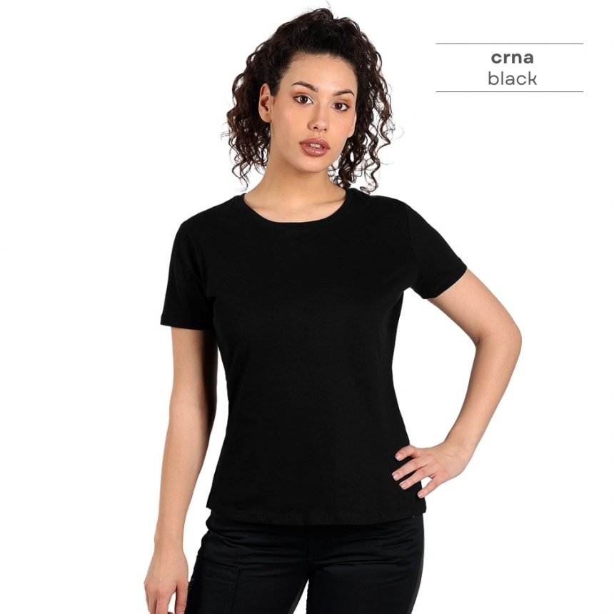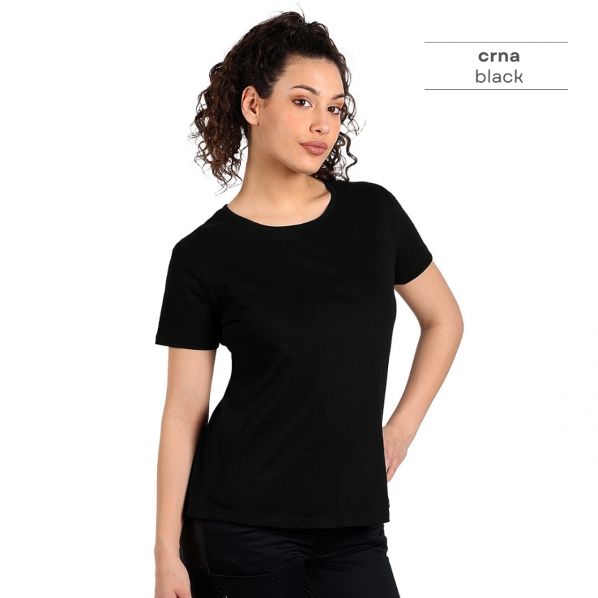 Pamučna ženska majica visokog kvaliteta, od 100% češljanog pamuka*, sa dve završne obrade, što joj omugućuje veću otpornost na habanje. Zbog toga se može prati više puta bez promene forme, što je čini idealnom za svakodnevno nošenje i intenzivnu upotrebu. Posebno je pogodna za radnice na otvorenom jer tamne boje ne blede na suncu. Majica je strukiranog kroja, materijal težine 160 g/m2, šivena sa strane, dupli štepovi na renderu, rukavima i dnu, dodatni štep duž ramena, okovratnik ojačan trakom. * model melanž sive boje je sir. sastava 90% češljani pamuk, 10% viskoza