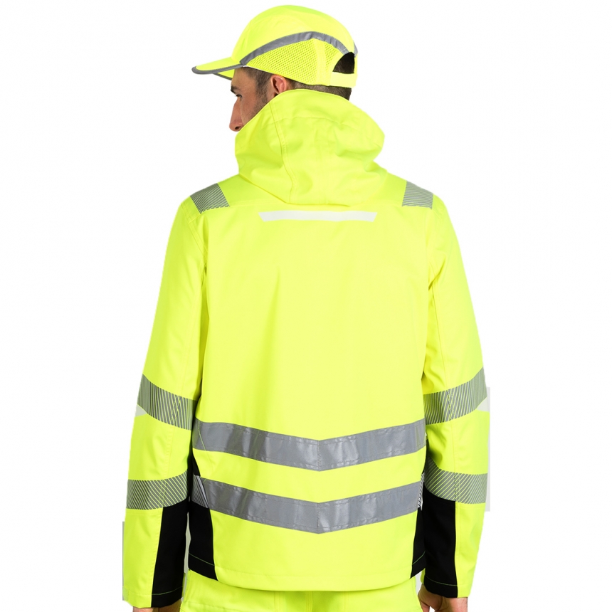 Zaštitna radna jakna sa kapuljačom, izrađena od kepera težine 280 g/m², sa mrežastom postavom, pruža visoku zaštitu i udobnost. Materijal je 100% poliester sa TPU membranom koja pruža vodonepropustljivost i paropropusnost (3.000 mm vodonepropustljivost i 3.000 g/m2/24h paropropusnost). Jakna ima reflektujuće detalje za bolju vidljivost, visokokvalitetne YKK rajsferšluse, podesivu kapuljaču i pojas. IMa dva prednja džepa, dva džepa na grudima, unutrašnji džep, etiketu za lične podatke i belu keramičku štampu koja svetli u uslovima smanjenog osvetljenja. Idealna je za rad u uslovima slabije vidljivosti, pružajući sigurnost i funkcionalnost. Sertifokovano po EN ISO 20347.