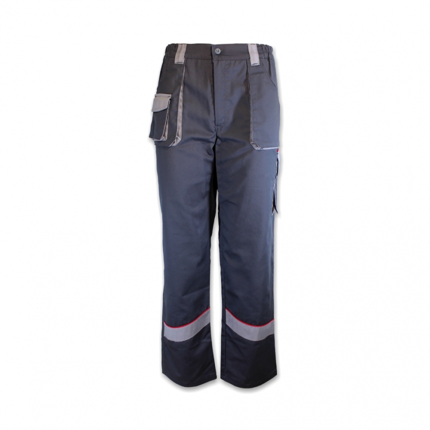 Radne pantalone od diolena, sastava 65% poliester 35% pamuk, sive boje, težine 245 g/m2, sa više praktičnih džepova. Dodatni džepovi imaju bočne falte, zbog dodatnog komfora.