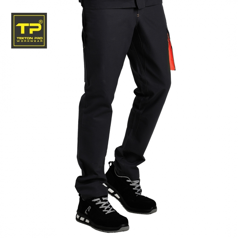 Radne pantalone od istegljive (elastične) tkanina tako da prati pokrete tela i vraća se u prvobitni položak, sastava 59% pamuk 39% poliester 2% elastin, težine 260 g/m2, platno prepletaj. Ojačanja od 600D poliestera na mestima izloženim većem habanju (kolena, džepovi), džepovi za umetanje EVA štitnika za kolena, dva prednja, dva zadnja i dva bočna džepa, reflektivni detalji, praktični odeljci za alat, gajka za čekić, plastična alka za ključeve, pojas sa lastišem za dodatnu udobnost, etiketa za lične podatke unutra, trostruki štepovi kao ojačanje. Tabela veličina:
