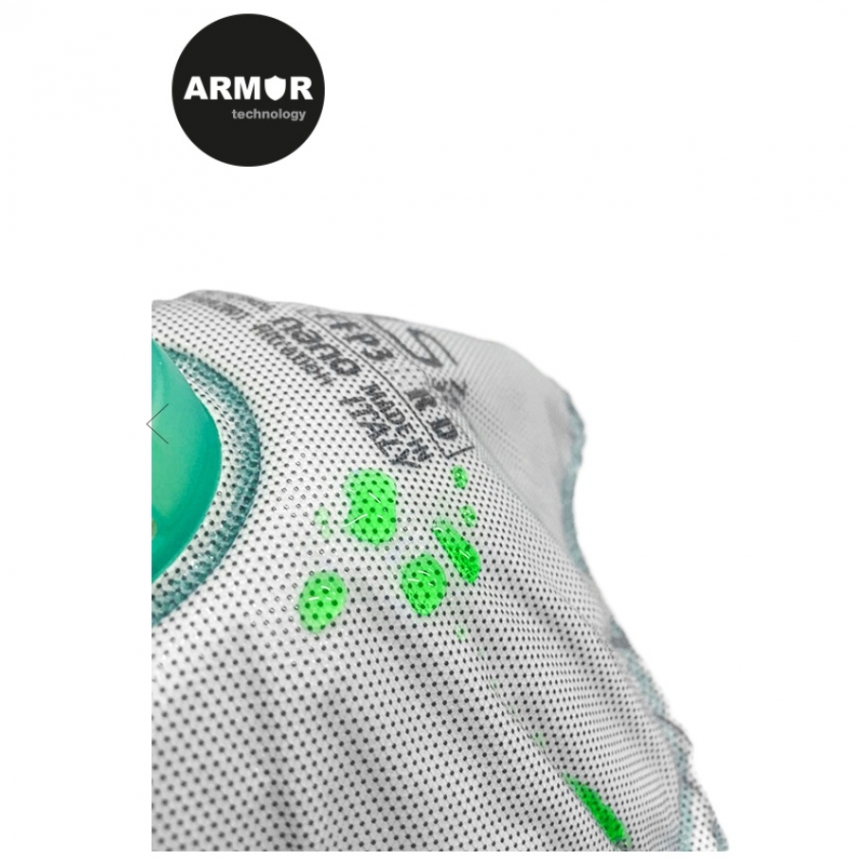 Karakteristike materijala respiratora: Maska: puna (ceo respirator) sastav polimer i poliester (PES) Vezica: vareni termoplastični elastomer (TPE) Kvačica za nos: polipropilen (PP) Ventil: polipropilen i guma Sloj za filtriranje: polipropilen Zaštitni sloj: poletilen Težina: 20 grama EN 149:2001+A1:2009 Deklaracija
